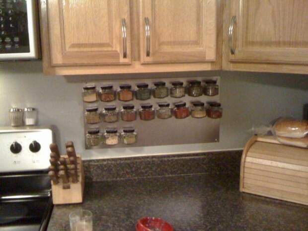 Идея такая: мы сделаем металлическую доску над столом, а к баночкам со специями приклеим магнитики.