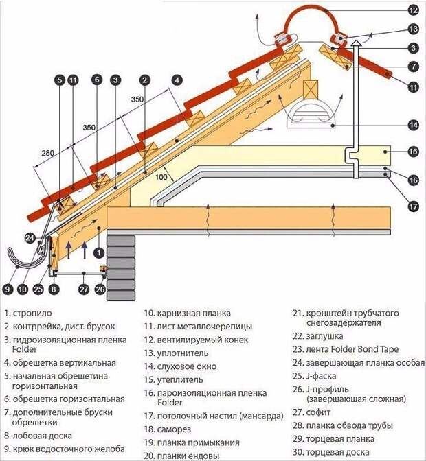 Для избежания подобных явлений рекомендуется использовать утеплитель расчетной толщины, который необходимо защитить со стороны металлочерепицы при помощи гидроизоляционной и пароизоляционной пленки. Обязательно обустраивается естественная вентиляция, для устранения из подкровельного пространства влаги, чтобы воздух беспрепятственно имеет проход от карниза к коньку, для чего между гидроизоляцией и металлочерепицей при помощи обрешетки создается специальный вентиляционный зазор, размерами около 40 мм. В свесах кровельной конструкции оставлют щели около 50 мм, а в уплотнительном материале конька делают специальные отверстия.